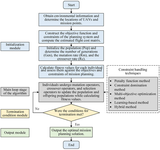 Figure 5 is based on the differential evolution (DE) algorithm [85], and the evolutionary process is divided into four modules: the initiation module, the main loop module of the algorithm, the termination module, and the output module. In the initiation module, first environmental information is obtained to determine the UAV start point and the mission. Next, the objective function and constraints are constructed, and the estimated voyage cost matrix is calculated. Then, the population (Pop) is initialized; the iteration number (Gen), variation rate (Rm), and crossover rate (Rc) are determined; and the fitness value is calculated for each individual. The main loop module of the algorithm generates the sub-generation population using the variation operator, crossover operator, and selection operator and re-evaluates the fitness value of each individual in the population after each iteration. The termination module determines whether a predefined termination condition (e.g., reaching the maximum number of iterations or converging to some optimal solution) has been reached. If the termination condition is reached, the output module is entered. Otherwise, the main loop module continues. The output module outputs the UMP solution that satisfies the conditions. However, using only differential evolutionary algorithms may lead to the following problems: (1) a lack of feasible solutions, as the algorithm may generate a large number of solutions that do not satisfy the actual constraints; (2) low-quality solutions, as the generated solutions may not be able to balance multiple optimization objectives; and (3) convergence, as the algorithm may have difficulty efficiently converging to the optimal solution in the presence of a large number of constraints.