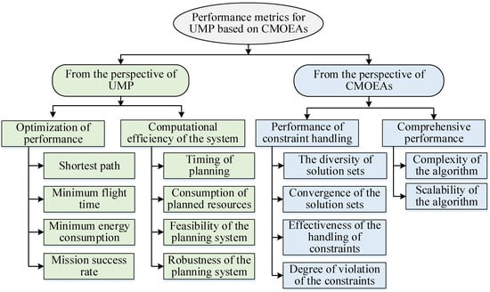 - According to the UMP execution process based on CMOEAs, we highlight individual setup methods for different populations and improvement strategies to help researchers and scholars quickly find suitable setup methods for different planning scenarios. At the same time, we propose for the first time to evaluate UMP performance from the perspective of UAV performance metrics and algorithm performance metrics together.