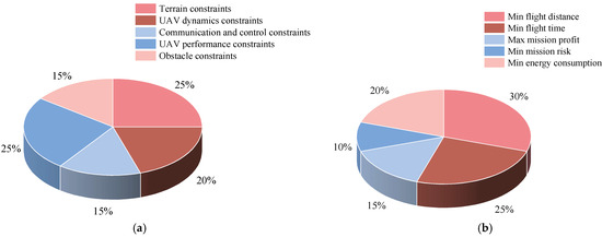 UAV dynamics and performance constraints directly affect the UMP program and its execution. A UAV’s dynamics include its flight performance, maneuverability, and flight stability [39]. These characteristics determine parameters such as a UAV’s speed, flight altitude, and fastest flight time when it is performing its mission. In addition, the performance constraints of a UAV, such as its load capacity, battery life, and sensor performance, also have significant impacts on UMP. Decision makers need to take these factors into account to determine the optimal flight trajectory, flight altitude, and flight speed to maximize the efficiency and success of mission execution.