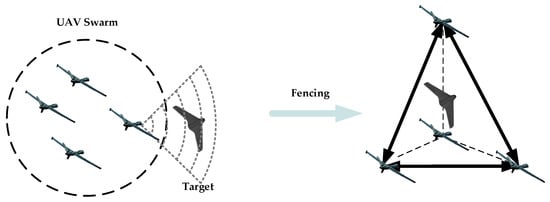 Target fencing control aims to design a cooperative controller for a group of UAVs to enclose the target within their flight convex hull [8]. The design of the fencing strategy focuses on four main aspects. The first aspect involves how to obtain the target’s unknown state. In practical tracking or fencing scenarios, the target is typically uncooperative, implying that its speed and control input are not directly accessible. Several studies assume that the target’s states were partially or entirely known by UAVs. In [9], a high-order sliding mode observer was designed to estimate the unmeasurable linear velocity of the target, enabling UAVs to enclose the target in the desired formation. In [10], the target’s state can be obtained by certain UAVs and transmitted to their neighbors through the network for distributed estimation within each formation form. An adaptive extended state observer was constructed in [11] which can simultaneously estimate the leader’s maneuvers and external disturbances.