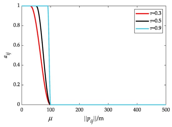 In practical applications, the performance of sensors is related to the distance between UAVs. Therefore, combined with the dynamic topology, the communication weight based on relative distance is defined as follows.