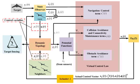 In this section, the cooperative target fencing controller designed for UAV swarms consists of three components: a navigation control term , a collision avoidance and connectivity maintenance term , and an obstacle avoidance term . The schematic diagram of the cooperative target fencing control is illustrated in Figure 4.