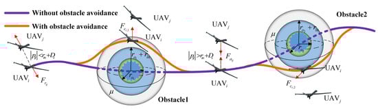 To further illustrate the obstacle avoidance process of the swarm, a schematic diagram of the obstacle avoidance potential field is shown in Figure 6. It is noteworthy that this paper distinguishes itself from others solely focused on obstacle avoidance by also considering collision avoidance and connectivity maintenance among UAVs within the context of obstacle avoidance.