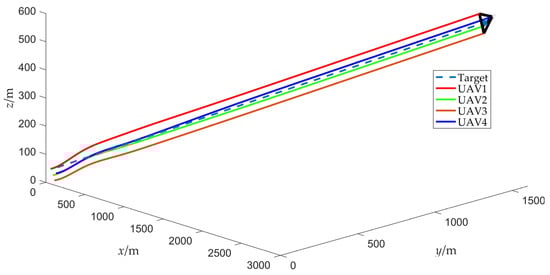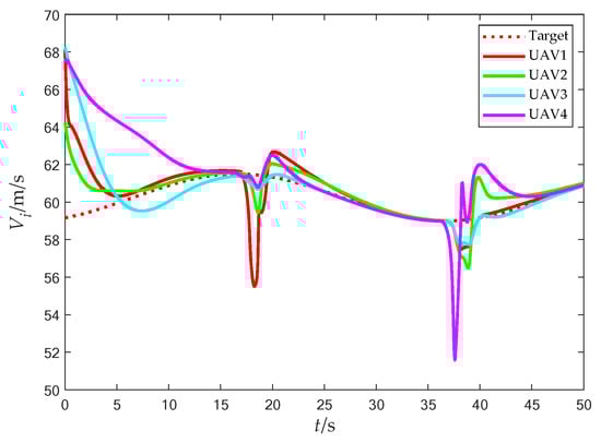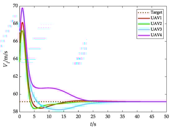 Figure 11 and Figure 12 show the relative distance and flight speed, and each UAV maintains a fixed distance from the target while moving at a consistent speed. Combined with Figure 10, it can be seen that the UAV swarm is capable of achieving a stable flight convex hull configuration and fence the target, which further explains Remark 4 in Section 3.2.1.