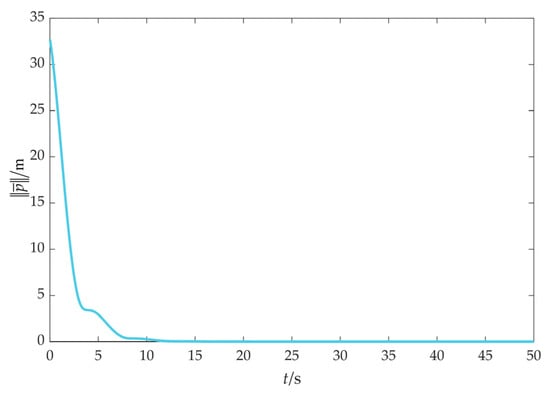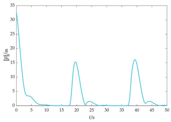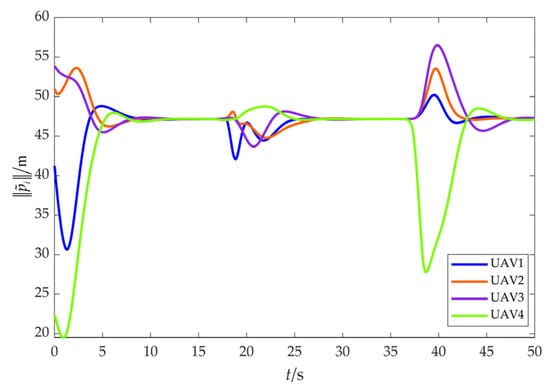 Figure 21 depicts the relative distance . It is shown that there are significant fluctuations in the evolution curve of during the obstacle avoidance process, but it still consistently converges to a constant value, which means that UAVs can form a stable convex to fence the target.