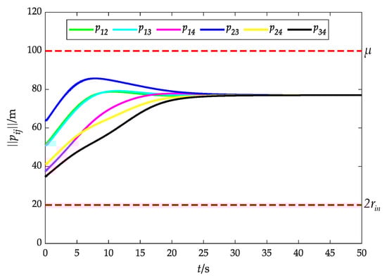 Figure 10 illustrates the relative distance between UAVs, and it is obvious that is consistently upheld during the fencing process, that is, UAVs can avoid collision and maintain the connectivity under the potential function (16).