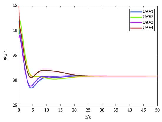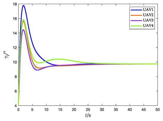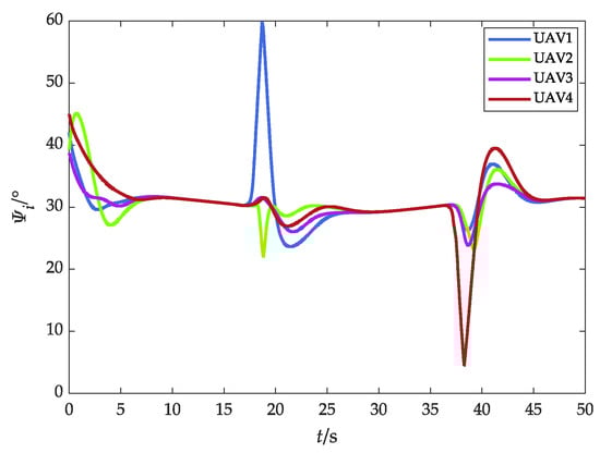In this paper, the nonlinear model in [37] that satisfies the relevant assumptions is used to describe the motion of the fixed-wing UAV swarm. The related variables are defined under the inertial frame in Figure 1.