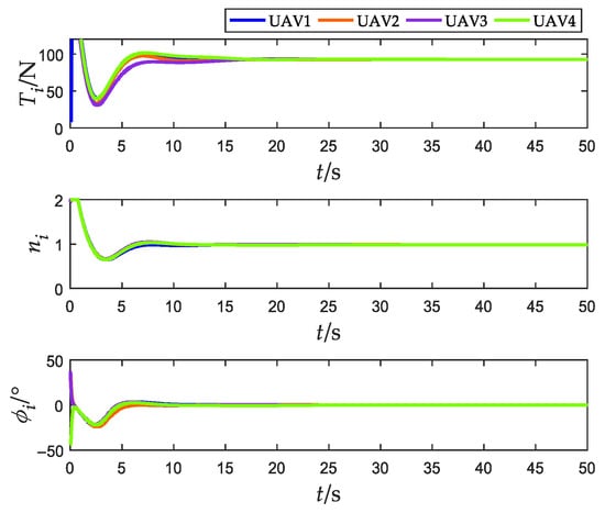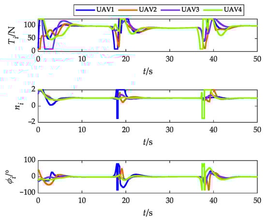 where is the index of the UAVs, and , , , and represent the position, speed, flight-path angle, and heading angle of the -th UAV, respectively. , , , and represent the mass, gravitational acceleration, lift, and drag, respectively. The actual control vector represents the thrust, g-load, and banking angle. Moreover, the constraints on the relevant variables are as follows: , , , , , and .