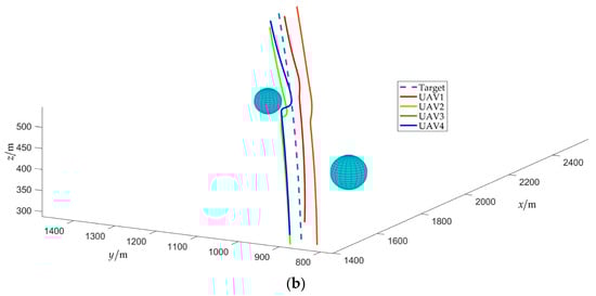 The flight trajectory of the target is ideal under , that is, no problems of obstacle avoidance arise with the target.
