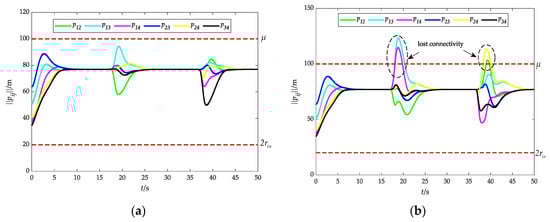 Relative distance between UAVs (with obstacles) (a) with connectivity maintenance; (b) without connectivity maintenance.