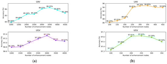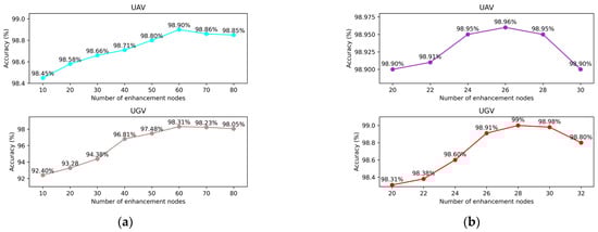 The parameters used for fault diagnosis. (a) The different enhancement nodes parameter settings of fault diagnostics for UAV–UGV system; (b) the different feature nodes parameter settings of BLS 2 for UAV–UGV system.