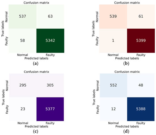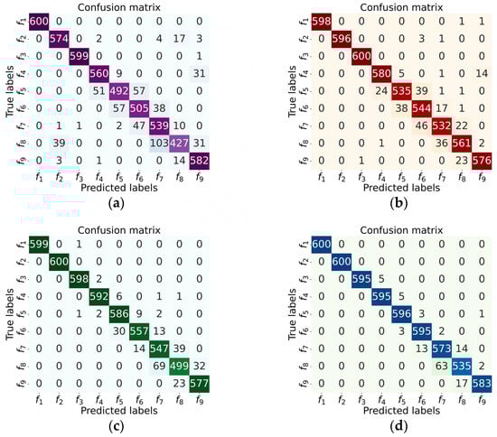 Figure 5 shows the results of the collaborative fault diagnosis. Specifically, Figure 5a,c demonstrate the diagnostic accuracy of the UAVs and UGVs without ZCA, and we achieve accuracies of 90.33% and 95.46%, respectively. In contrast, Figure 5b,d present the FD accuracy of the UAVs and UGVs with ZCA, and we achieve accuracies of 94.85% and 97.62%, respectively. These results indicate that the diagnostic performance significantly improves after applying ZCA for data processing.
