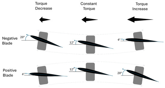 As shown in Figure 7, the pitch moment for longitudinal control is activated when the rotor passes through the position then the acceleration of the rotor lags the blades with respect to the center of the rotor increasing the angle of attack of the positive blade up to and decreasing the angle of attack of the negative blade up to synchronously. This control command tilts the thrust vector to forward or backward, producing a pitch moment and consequently a longitudinal displacement.
