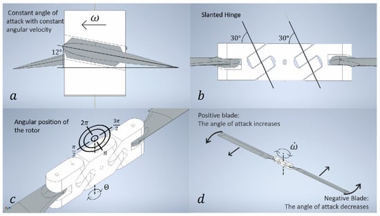 The constant torque means constant angular velocity of the rotor and keeps the angle of inclination of the propeller blades constant at 12 degrees (see Figure 3a). This would be the case of the helicopter in hover under ideal conditions, without roll or pitch control inputs. The main parts of the rotor are the brushless motor, the central hub fixed to the motor shaft, the propeller bases which are attached to the rotor hub by two angled and parallel hinges and the symmetrical airfoil blades, see Figure 3b. Due to the inertia of the blades, they convert the variations in angular velocity into an orderly and synchronous change of the blades angle of attack.