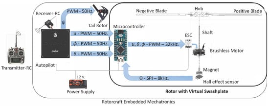 Figure 4 shows the Pixhawk Cube Black as an autopilot, it has redundancy in inertial sensors and a frequency of 168 MHz for the fusion and processing of signals and control algorithms. The PWM signals that come out of the autopilot are the yaw moment control that is sent directly to the Electronic Speed Controller (ESC) tail rotor and the thrust, roll, and, pitch moment control signals with a frequency of 50 Hz. The microcontroller receives the control signals of the autopilot and the angular position of the main rotor from the Hall effect sensor through the SPI port at a frequency of 8 kHz. The microcontroller fuses and processes the control and rotor angular position signals at a frequency of 16 MHz to send to the High frequency ESC of the main rotor brushless motor at a frequency of 32 kHz considering that the motor can reach up to 6000 revolutions per minute. The autopilot and the microcontroller are programmed with their own language based on C++. The autopilot firmware does not have a default configuration for a virtual swashplate helicopter and the mixer also needed to be created.