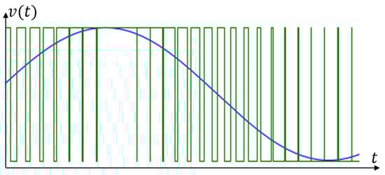 The high-performance electronic speed controller processes the PWM signal of nominal input frequency up to 40 kHz whose pulse width varies from 1 ms to 2 ms. Figure 5 shows the pulse width modulation with a sinusoidal reference where many pulses are produced in each rotation cycle of the main rotor to virtually emulate the control of a traditional swashplate.