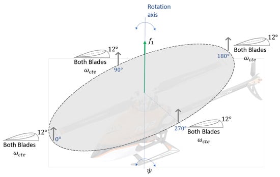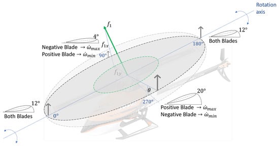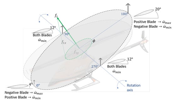 As shown in Figure 6, the roll moment for lateral control is activated when the rotor passes through the position then the acceleration of the rotor lags the blades with respect to the center of the rotor increasing the angle of attack of the positive blade up to and decreasing the angle of attack of the negative blade up to synchronously. This control command tilts the thrust vector to the left or right, producing a roll moment and consequently a lateral displacement.