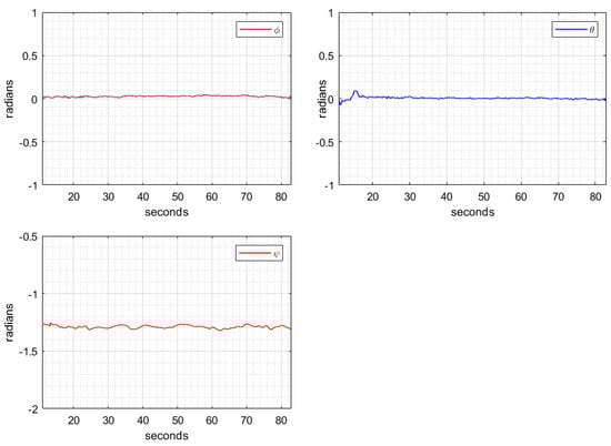 Figure 10 shows the performance of the control algorithm for the roll, pitch and yaw angles of the helicopter with virtual swashplate. The reference for the roll and pitch angles is zero while the reference for the yaw angle is −1.3 radians.