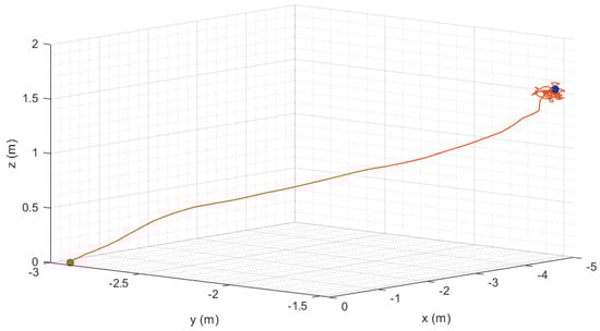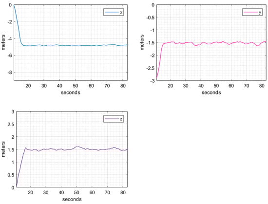 Figure 11 shows the performance of the virtual swashplate helicopter position control algorithm during hover flight. The references for the position are −4.7 m for the x axis, −1.5 m in the y axis and 1.5 m for the z axis.