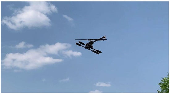 Due to the gyroscopic effect, a pitch angular momentum induces a roll angular momentum, i.e., with a displacement of , as shown in Figure A1. An empirical adjustment is applied so that the behavior of the helicopter is correct.