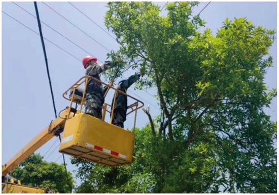 Transmission lines are a crucial component of the power network [,], frequently impacted by weather, vegetation, animals, and human activities. Trees near high-voltage transmission corridors often grow beyond safe distances, causing the lines to discharge through the trees to the ground. This can lead to power outages, fires, and other safety incidents, creating significant inconvenience for production and daily life. This issue has long been a challenging problem. As a result, power departments expend considerable manpower and resources annually to clear tree obstacles. However, relying solely on traditional manual operations for grid maintenance requires a substantial workforce, far exceeding the current number of available workers in the power sector (Figure 1). Additionally, in complex terrain conditions, manual workers face significant safety risks, such as maintaining transmission lines in mountainous areas and large lakes, especially under harsh weather conditions (such as winter and summer) and at night [,]. In these adverse conditions, the difficulty of manual maintenance work increases significantly, and the associated costs also multiply. Therefore, the power sector urgently requires an automated tool to replace manual labor to overcome these challenges. This will ensure the more reliable and long-term operation of the power grid system, thereby guaranteeing the long-term stable supply of electricity for industrial production and daily life [].