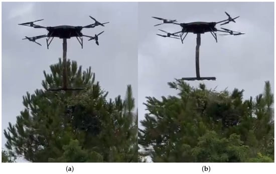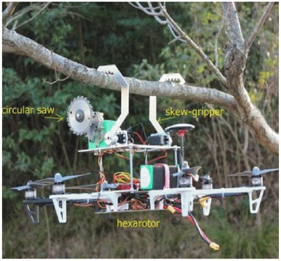This paper focuses on the application of tree obstacle clearing drones for power transmission lines, examining the design, modeling, control, and application of such drones. These drones introduce a novel approach to clearing tree obstacles, transforming the traditional reliance on manual labor. They enable precise cutting of tree obstacles, enhancing operational safety and efficiency, while eliminating the risk of accidents associated with manual labor. As early as 1989, Cox [] proposed the design of a helicopter equipped with a suspended circular saw for trimming tree branches. Molina [,] developed a drone-based multi-rotor robot equipped with inclined pliers for clearing tree obstacles (Figure 2). Before operation, the robot uses the pliers to suspend itself from the trunk to be cut, and then it begins the cutting task. However, the operational device mounted on the drone is not sufficiently distanced from the body, requiring the robot to fly into the tree during operation. This increases the risk of the propellers being disturbed by branches and leaves, potentially leading to crashes. Azami [] developed a suspended chainsaw robot based on an octocopter to address the threat of tree obstacles near high-voltage power lines. Later, Xu [,] designed a novel forward-positioned saw drone for clearing tree obstacles (Figure 3). Due to the cutting tool extending beyond the projection area of the rotors, controlling the drone presents considerable challenges. Subsequently, to address the issues of forward-positioned saw drones, Liao [] proposed a novel drone with a suspended retractable saw to prevent collisions between the rotors and tree obstacles while improving operational efficiency. However, this structure features a rigid connection between the drone and the suspended saw. Due to the lack of buffering and vibration damping capabilities, the disturbances generated by the saw during operation significantly affect the drone’s stability, potentially leading to instability. In conclusion, the main problems currently faced in the field of tree obstacle-clearing drones include: