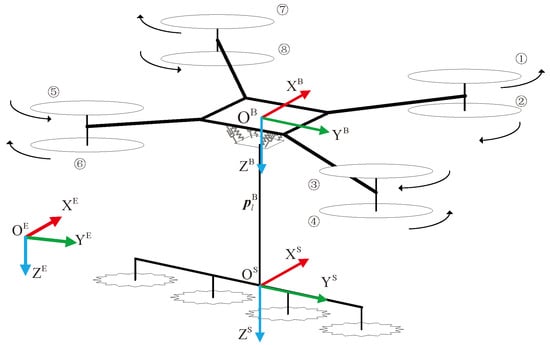 The TOCCO-FSS is simplified and a coordinate system is defined as in Figure 5. The airframe consists of a coaxial octocopter, with each pair of rotors spinning in opposite directions on the same axis, and the lift force is directed along the negative of . The Earth coordinate system is , the airframe coordinate system is , fixed at the center of mass of the airframe. The saw coordinate system is , fixed at the center of mass of the saw. Define the length of the saw from the lower end of the flexible suspension system in the airframe coordinate system as .