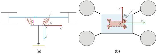 - The flexible suspension system can be equivalently modeled as a three-dimensional spring-damper system in space, and it is connected at the center of mass of the drone. Its front view and top view are shown in Figure 6. It consists of four identical diagonally arranged spring-damper units, which are symmetrically inclined with respect to the XY axes in the body coordinate system;