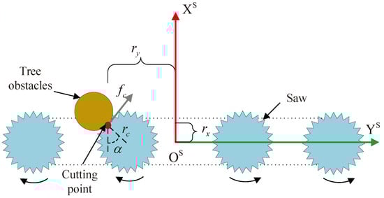 The schematic diagram for cutting a tree barrier is shown in Figure 7. When cutting, the tree barrier may be cut by any one of the two pairs of circular saws, and the position of the cutting point corresponding to the coordinate system of the saw is . The cutting angle is and the radius of the circular saw is . The resistance to cutting cannot be measured directly, but can be calculated by analyzing the energy. It is generated by the saws cutting the tree, so it is only necessary to obtain the cutting power and the cutting speed , which can be calculated as follows: