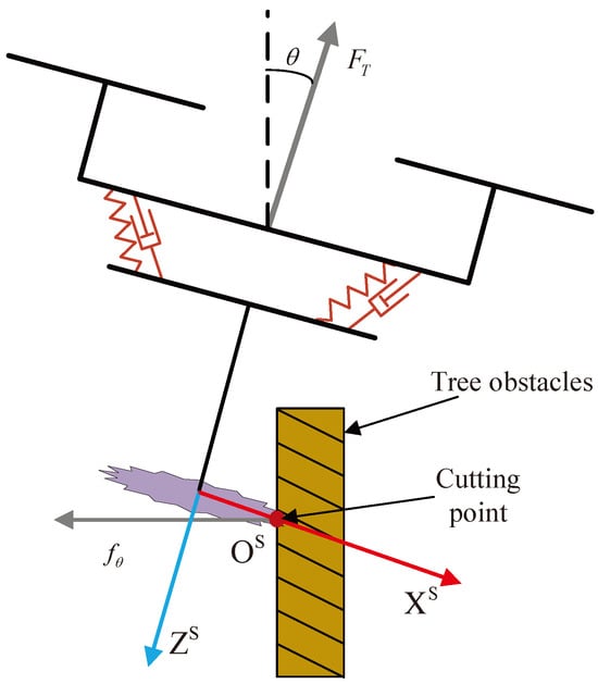 Aiming at the trouble of possible impact force when contacting tree obstacles during drone operation, one approach is to adopt an active flexing method, that is, to overcome the impact force by the active flexing control of the drones [], but this approach needs to obtain the contact force directly or indirectly, and it is more difficult to obtain the contact force for drones saws and tree obstacles in the practical engineering. Moreover, the problem of the rigidity of the drones themselves has not been solved, and the risk of losing control of the drones is still high.The other approach is to take a passive physical flexibility mechanism, that is, to take a flexible suspension to buffer the impact force of contact []. Physical flexibility involves inserting elastic damping units [] such as springs, torsion springs, and hydraulic dampers into the system and utilizing these elastic units as force and motion transfer units. This method greatly reduces the stiffness of the entire drones, thus making the system itself naturally flexible. Due to the flexibility brought about by the elastic units, in the event of an accident such as a collision, the drones can passively store and absorb the impact energy generated by the collision through the elastic elements, thus protecting the drones’ fuselage and improving the environmental adaptability and safety of the drones [].