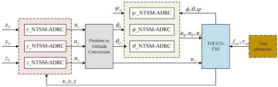 In addressing the issue of external reaction forces and moments in contact operations, while flexible suspensions can provide cushioning during drones operation [], too strong elasticity or too weak damping of flexible suspensions can lead to periodic oscillations. Additionally, the non-rigid structure will bring parameter disturbances and channel coupling interference, which puts higher requirements on the interference suppression performance of the drones controller. Comprehensively, the drone with a flexible suspension structure has to resist the reaction forces and moments during operation in addition to overcoming the additional disturbances brought by non-rigid factors. In order to solve these problems in control, we need to research a control method that has fast convergence capability and is resistant to internal and external disturbances. The traditional PID control structure is simple, but the adjustment of PID parameters relies heavily on experience, and the disturbance suppression ability is limited, making it difficult to achieve the best results. Although LQR control has high accuracy and can achieve the best performance index, it lacks interference resistance and robustness. Active Disturbance Rejection Control (ADRC) consists of three main components: Tracking Differential (TD), Nonlinear State Error Feedback (NLSEF) control law, and an Extended State Observer (ESO) []. Although ADRC has better disturbance immunity, its control fastness and convergence need to be strengthened because the ESO’s observation of the coupling term will be directly compensated by the linear compensation to the output of the NLSEF. Traditional sliding-mode control (SMC) [,] uses a linear sliding surface. When the system state reaches the sliding surface, the system response becomes insensitive to internal parameter uncertainties and external disturbances, which gives the SMC controller good robustness. Although the control structure of SMC is simple, it suffers from chattering problem and weak disturbance suppression capability. In recent years, terminal sliding-mode control (TSMC) has shown excellent performance in practical applications. For example, the system state error can converge to zero in a finite time, the controller gain can be significantly reduced compared with the linear sliding surface, and the steady-state accuracy is higher than that of the conventional SMC. However, when the system is close to the equilibrium state, the general TSMC method encounters the singularity problem. Therefore, in order to solve the singularity problem, non-singular terminal sliding-mode control (NTSMC) [] has been proposed, and a variety of improved non-singular terminal sliding-mode control methods have been developed, such as integral non-singular terminal sliding-mode control, fast non-singular terminal sliding-mode control [], adaptive non-singular terminal sliding-mode control [], and so on. In this paper, in order to solve the problems of internal parameter perturbations and external contact reaction forces and moments of the TOCCO-FSS, and at the same time to improve the system’s immunity, fastness and robustness [], the Active Disturbance Rejection Control (ADRC) with strong anti-interference advantages is combined with the Non-Singular Terminal Sliding-Mode Control (NTSMC) with rapidity and robustness, resulting in the Non-Singular Terminal Sliding-Mode Active Disturbance Rejection Control (NTSM-ADRC) algorithm, which is proposed to achieve stable position and attitude control of the TOCCO-FSS.