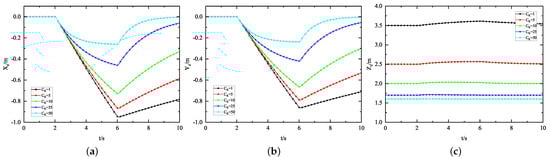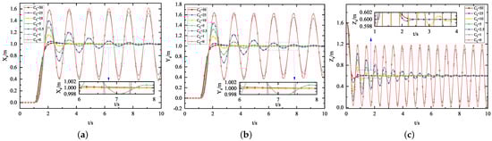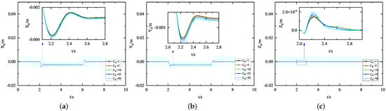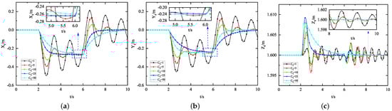In Figure 14, it can be seen that with a constant spring coefficient, different damping coefficients have a significant impact on the saw’s stability. When the damping coefficient is , the saw exhibits almost no oscillation. As the damping coefficient decreases, the oscillation amplitude of the saw increases. When the damping coefficient is , the saw experiences sustained oscillations of equal amplitude. The reason for this is that the elastic potential energy of the spring cannot be dissipated. It is worth noting that under different damping coefficients, since the spring coefficient remains constant, the oscillation period is consistent.