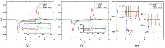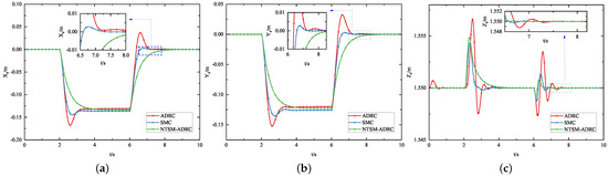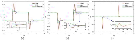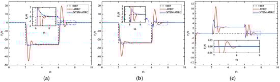 The simulation results are shown in Figure 16, Figure 17, Figure 18, Figure 19 and Figure 20. In these figures, the influence of contact disturbances can be seen. Under the external force, the position under NTSM-ADRC drifted by a small amount, the position under SMC drifted by a slightly larger amount, and the position under ADRC drifted by a large amount relative to NTSM-ADRC and SMC. The steady-state error is smaller in the presence of disturbances, and the system can quickly return to its original position after the disturbance disappears under NTSM-ADRC. So, NTSM-ADRC provides better control performance compared to SMC and ADRC. Since ADRC and NTSM-ADRC have observers and SMC does not, SMC is not included in the disturbance estimation in Figure 19 and Figure 20, and it can be seen that NTSM-ADRC converges faster to the disturbance estimation with less oscillation. Additionally, from the saw position change curve in Figure 17, it can be observed that with the buffering provided by the flexible suspension system, the position of the saw changes gradually and does not experience abrupt shifts due to disturbance impacts. This buffering effect of the flexible suspension reduces the impact of contact disturbances on the airframe during saw operation. Additionally, because of the better airframe position and attitude control under NTSM-ADRC, the saw changes more slowly and its buffering is better.