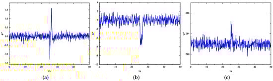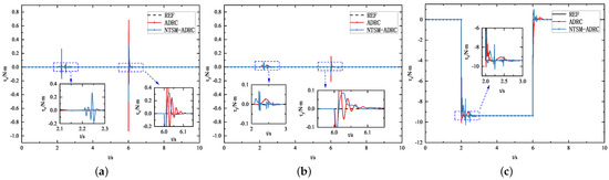 Assume that at 2 s, the tree cutting begins with a 5° pitch angle. The cutting position is , the cutting angle is , the cutting power is 250 W, the cutting radius is 0.2 m, and the cutting speed is . The cutting operation is completed at 8 s. The total disturbance force and torque generated are given by Equation (44).