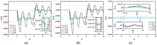 The contact operation with different coefficients simulation curves for the three-axis positions of the airframe. (a) X-axis curve of the airframe. (b) Y-axis curve of the airframe. (c) Z-axis curve of the airframe.