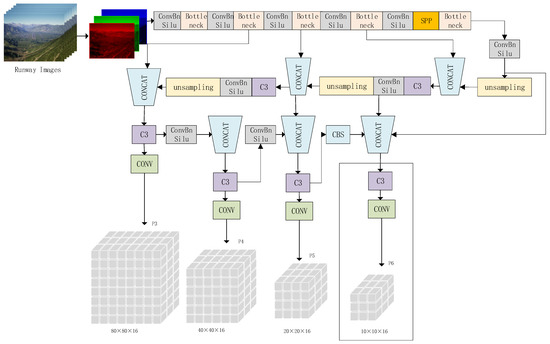 Specifically, in the YOMO-Runwaynet detection algorithm, our goal is to design the network with a focus on efficiency and accuracy. The input image is first divided into sub-images. If the center of a target to be detected falls within one of these sub-images, B prediction boxes is generated around that sub-image to include the target. The internal structure of the network, as shown in Figure 3, consists of three main components: the backbone, the neck, and the head.