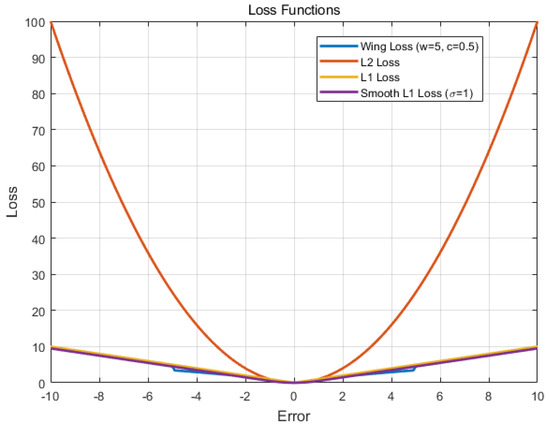 The Wing loss function used in this paper is compared with other loss functions, as shown in Figure 6. Notably, the Smooth L1 loss is a special case of the Huber loss. While the L2 loss function has been widely used in previous keypoint detection tasks, it is more sensitive to outliers. The comparison demonstrates the Wing loss function’s effectiveness in reducing the impact of outliers and improving performance in keypoint detection tasks.