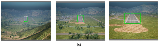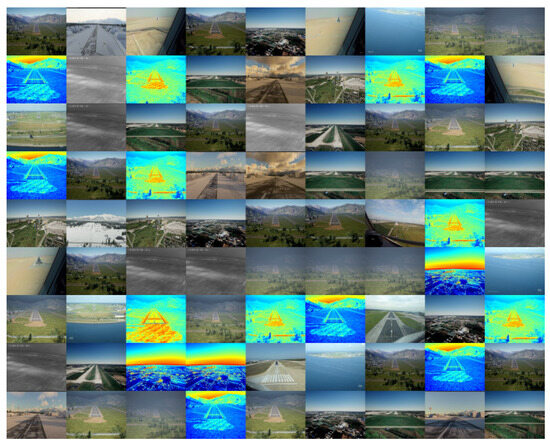 The training and testing of the YOMO-Runwaynet algorithm is based on real flight data collection and UE platform simulation, utilizing the Aerovista Runway Dataset (ATD). This dataset includes runway data from eight different scenarios covering various terrains such as mountains, cities, farmland, and oceans, reflecting typical global airports. To ensure robustness, the data are further divided into different weather conditions like sunny, rainy, snowy, and foggy, totaling 16 scenarios. The dataset comprises 11,904 sequential images, including multi-runway civil airports and infrared runway data, as shown in Figure 7.