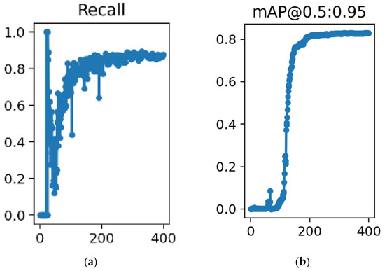 The mean average precision (mAP) was used as the evaluation metric. After 400 epochs of training, the precision of the YOMO-Runwaynet converged to 0.855. The recall of YOMO-Runwaynet converged to 0.829, and mAP also converged to 0.895. as shown in Figure 8a,b, respectively.