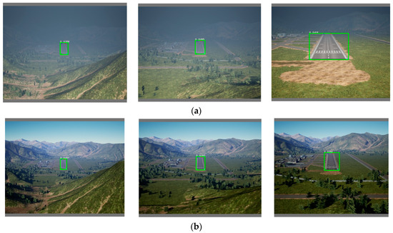 The detection results show that YOMO-Runwaynet achieved runway detection outcomes at different flight altitudes in the ATD-Mountain dataset’s mountain scenarios. As illustrated in Figure 9a, the results are shown for foggy conditions at flight altitudes of 300 ft, 200 ft, and 150 ft.