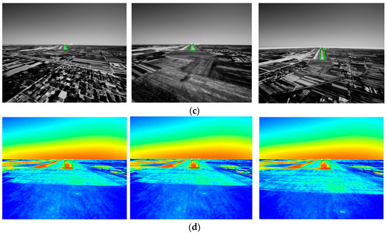 YOMO-Runwaynet testing results on the ATD urban scene dataset (data from different altitude segments in urban scenes: each group starts from the first column with altitudes of 600 ft, 300 ft, and 150 ft. Each row represents a set of data corresponding to: (a) sunny day with dual runways, camera installation angle 0°; (b) sunny day with dual runways, camera installation angle 3.5°; (c) urban scene with infrared camera; (d) farmland scene, camera installation angle 5°).