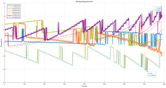 The definition of the detected corner points is shown in Figure 11. REALPOINT 1–4 and landmarks 1–4 represent the pixel ground truth and YOMO-Runwaynet detection values for the four corner points, respectively. These points correspond to the runway’s top–left (X1, Y1), bottom–left (X2, Y2), top–right (X3, Y3), and bottom–right (X4, Y4) corners. The pixel error results for these key points are calculated based on the feature corner error Equations (11)–(14). It can be seen that the lateral pixel X1 in the upper left corner has a maximum error of 1.12, The longitudinal pixel Y1 error is 3.18; the lateral pixel X2 at the lower left point has a maximum error of 1.98, Y2 maximum pixel difference is 1.3. This is available for the above analysis. The maximum pixel difference in the upper-right point is X3 Error max = 1.25, respectively, Y3 Error max = 3.05. The lower right point pixel error is X4 Error max = 1.73, Y4 Error max = 1.25. In conclusion, in the 1080p ATD runway test set containing Gaussian noise, the pixel error of the detection algorithm can be achieved: the pixel error rate of the lateral Xi detection is less than 0.001, and the pixel error rate of longitudinal Yi detection is less than 0.003.
