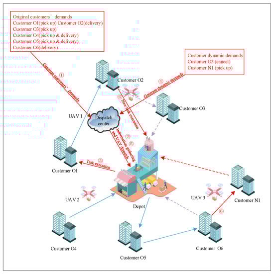 With the profound changes in the patterns of global economic development, and as the Internet of Things (IoT), artificial intelligence (AI), and other representative technologies of a new generation continue to develop and mature, the concept of “smart logistics” has emerged. This concept is typically regarded as a novel approach to leverage emerging technologies for more intelligent and efficient planning, management, and control of logistics activities [,,]. As a critical technological component in smart logistics, the unmanned aerial vehicle (UAV) has demonstrated its unique advantages in the field of logistics and distribution, particularly in short-distance distribution (such as last-mile delivery) scenarios and in areas with underdeveloped road infrastructure []. For instance, the Amazon’s prime air service employs the multi-rotor UAV for rapid delivery within 30 min, enhancing last-kilometer efficiency []. The DHL has introduced the parcelcopter UAV delivery service in Germany, capable of efficient delivery even in adverse weather conditions, surpassing the limitations of traditional logistics methods []. Additionally, Walmart is piloting UAV distribution in America, exploring their application for last-kilometer delivery to enhance the overall logistics efficiency []. These practical experiences underscore the UAV’s unique advantages in logistics and distribution.