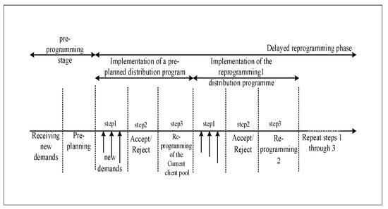 To cope with dynamic customer demands, two general processing methods are adopted: immediate and delayed processing. The immediate processing entails adding dynamic demands to the customer pool as soon as they arise and re-planning the distribution path based on new customer information. Although this method allows for timely response to new customer demands, frequent re-planning results in significant changes to delivery preparations. The delayed processing involves withholding dynamic demands from the customer pool until certain conditions are met for collective processing. These conditions typically encompass quantitative and timed processing approaches. Delayed quantitative processing waits until the customer’s demand changes reach a predefined threshold, at which location-accumulated demands are added to the customer pool for subsequent path re-planning. However, the interval before reaching this threshold can be prolonged, causing some dynamic demands to experience significant delays before being addressed. Delayed timed processing divides the depot’s operational hours into daily time segments, adding the accumulation of new customer demands to the pool at set intervals for path re-planning based on the updated pool. To mitigate excessive dynamic demand due to frequent path replanning and to prevent delays in processing customer demands during periods of low demand accumulation, which may not meet the processing threshold, we employ the delayed timed processing approach for managing dynamic customer demands.