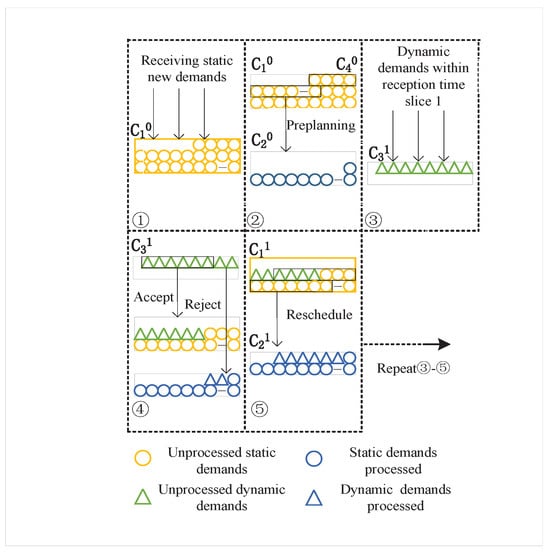 As depicted in Figure 3, the customer pool is divided into the pending customer pool and the processed customers pool , based on acceptance by the distribution system at time slice s and the status of pickup or delivery tasks. includes unprocessed customer locations and those newly accepted. comprises customer locations actively engaged in or having completed distribution tasks and newly rejected customer locations. During the replanning process, customer locations within current time slices meeting the earliest acceptable time window constraints are subject to replanning. Notably, the new customer demands are added to a new demand pool for assessment. If rejected, they’re moved to , otherwise to . In the delivery process, pending customer pools for each current time slice are updated accordingly. As the distribution advances, the current time slice for both pending and processed customer pools is continuously updated, and as each time slice elapses, customer locations in the pending pool meeting time window constraints transition to for inclusion in the replanning process.