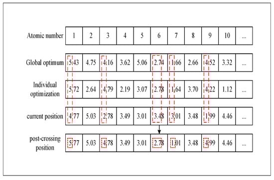 Within a single iteration of the particle swarm algorithm, two types of optimal particles are identified: individual optimal particles and the global optimum of the entire swarm. To accelerate the convergence and “inherit” superior dimensional values from a previous iteration, enabling newly generated particles to find improved positions, we propose a selection crossover strategy based on a PSO algorithm. The specific selection process for crossover is illustrated in Figure 5, using the i-th particle in the t-th iteration as an example. For particle i, this includes the swarm’s global optimal position, particle i’s historical optimal position, and the position of the optimal particle in the t-th iteration; positions of these optimal particles are compared, retaining those with identical values corresponding to particle i. For instance, in Figure 5, the optimal value 5 of the iterated particle at ordinal number 1 is swapped with 4 of the current particle’s position, yielding the new particle position , and values marked with dashed lines represent the dimensions’ optimal values retained from the previous iteration.