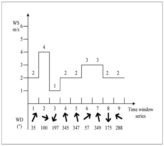 As shown in [], we discretize the dynamic wind speed and direction changes within the distribution area into distinct time windows, where wind conditions vary between windows, and assume a global influence of wind speed and direction across the entire UAV distribution range and process, with wind speed and direction for each time window anticipated in advance. Referencing the impact of wind speed and direction on logistics UAVs, as discussed in [], to maintain stable airspeed and adhere to predetermined flight paths amid wind influences, the UAVs must first adjust their heading angles to counteract lateral wind deflections, subsequently adjusting ground speed as necessary to preserve airspeed following heading angle corrections. Building on these considerations, the following sections will further explore the logistics UAV path planning problem, taking into account dynamic customer demand and wind conditions.