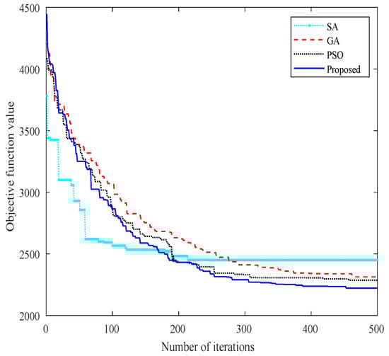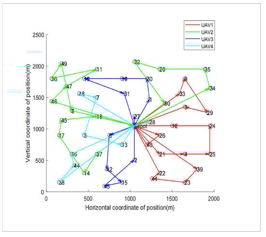 Figure 7 presents the convergence comparison graphs after 500 iterations of pre-planning the R201-50 dataset using the SA, GA, PSO, and proposed algorithm, respectively. It is observed that the objective function values of these four algorithms are , , , and , respectively. The objective function of the proposed algorithm shows a maximum reduction of about , which highlights the proposed algorithm’s superior efficacy in distribution path pre-planning. Furthermore, the proposed algorithm’s ability to escape local optima underscores its capability to generate superior distribution solutions compared to the other three algorithms. Figure 8 displays the optimal path planning graph for the R201-50 dataset, as derived from the proposed algorithm, with the corresponding delivery sequences for each UAV and their analyses presented in Table 9.