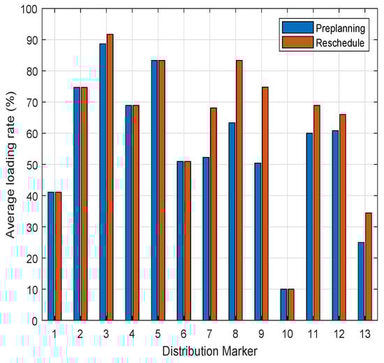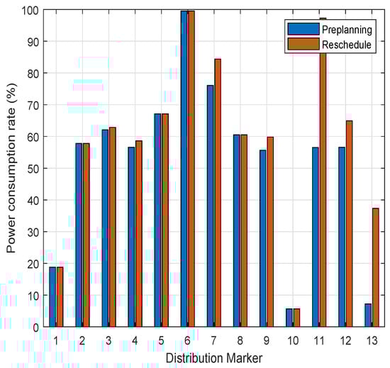 Figure 9 and Figure 10 compare the average loading rate and battery consumption rate between the final and pre-planned distribution sequences, respectively. Based on distribution markers 1–13, as detailed in Table 10, it is evident that the average loading rate for distribution paths involving re-planned customer locations improved by an average of , with a peak improvement of . Furthermore, as depicted in Figure 10, the ARK-150’s maximum battery capacity is 1600 Wh. When comparing battery utilization before and after pre-planning and re-planning, the average increase in battery utilization across the aforementioned distribution sequences is , equivalent to 252 Wh. Notably, distribution sequence 7 exhibits a remarkable increase in utilization. Thus, it can be concluded that UAV path planning, which accounts for dynamic customer demand, significantly enhances loading efficiency and battery utilization during delivery, adhering to the maximum UAV’s load and battery power constraints.