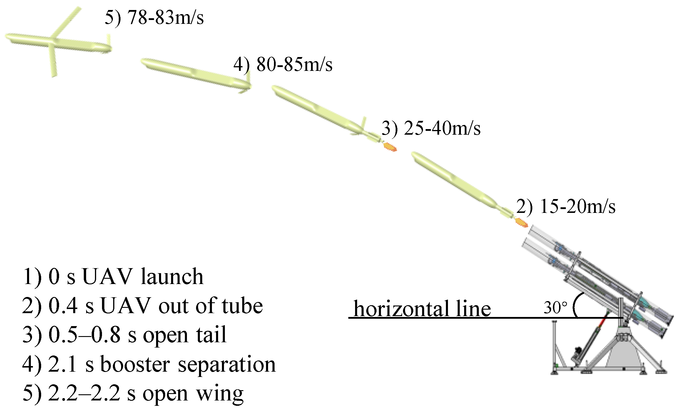 - Eymann, T.; Martel, J. Numerical investigation of launch dynamics for subscale aerial drone with Rocket Assisted Take-Off (RATO). In 2008 US Air Force T&E Days; American Institute of Aeronautics and Astronautics: Los Angeles, CA, USA, 2008; p. 1622. [Google Scholar] [CrossRef]